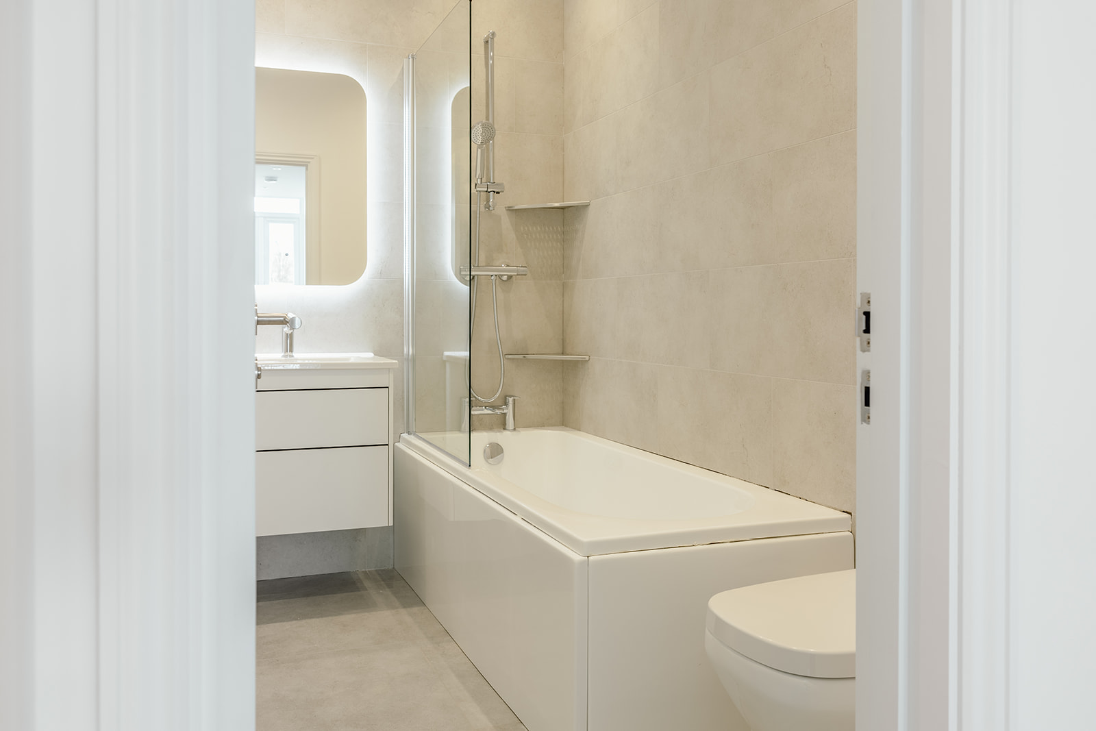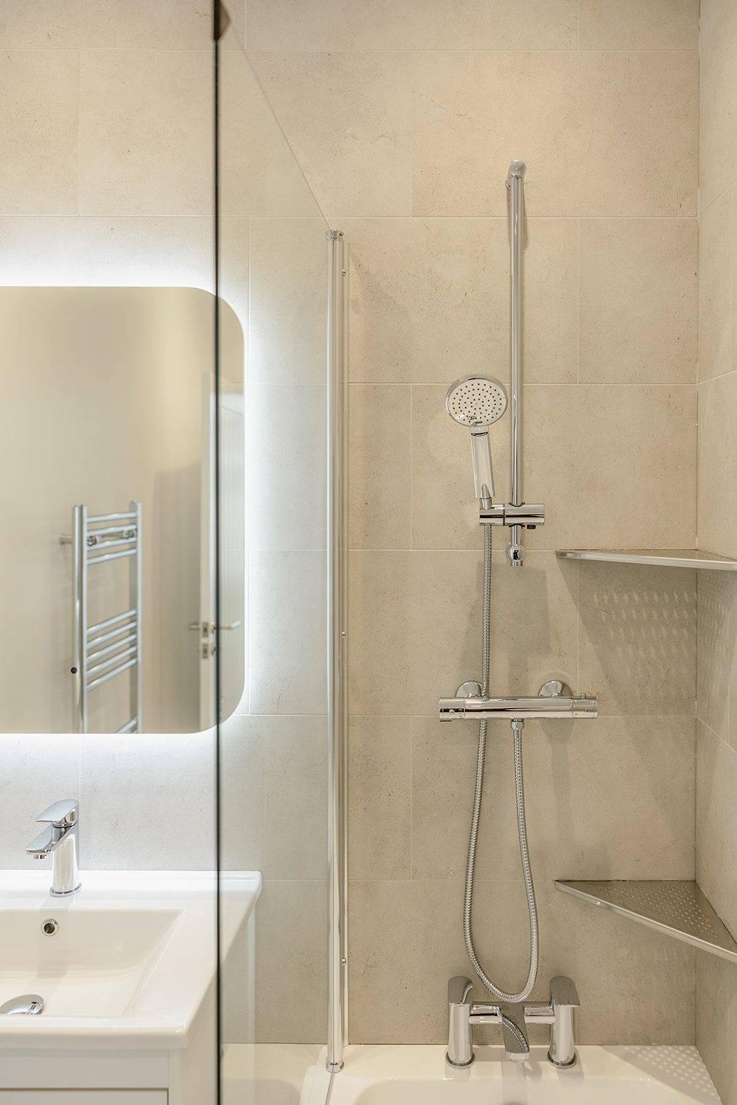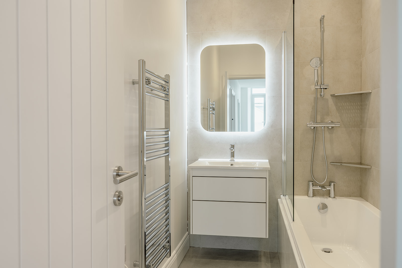 The apartment benefits from an impressive Victorian entrance, complete with a large hallway and a striking stained‑glass window. This leads into a wide internal hallway, a bright eat‑in kitchen fitted with Bosch appliances, and a separate living area. The master suite is exceptionally spacious including en-suite with under floor heating, and there is a second double bedroom along with a contemporary house bathroom with under floor heating.
